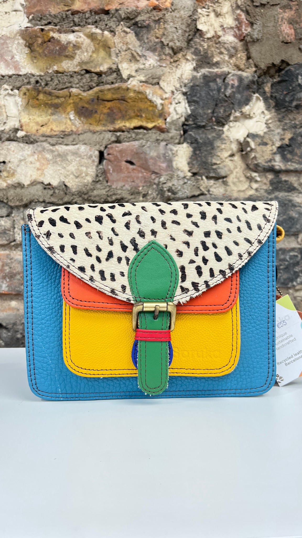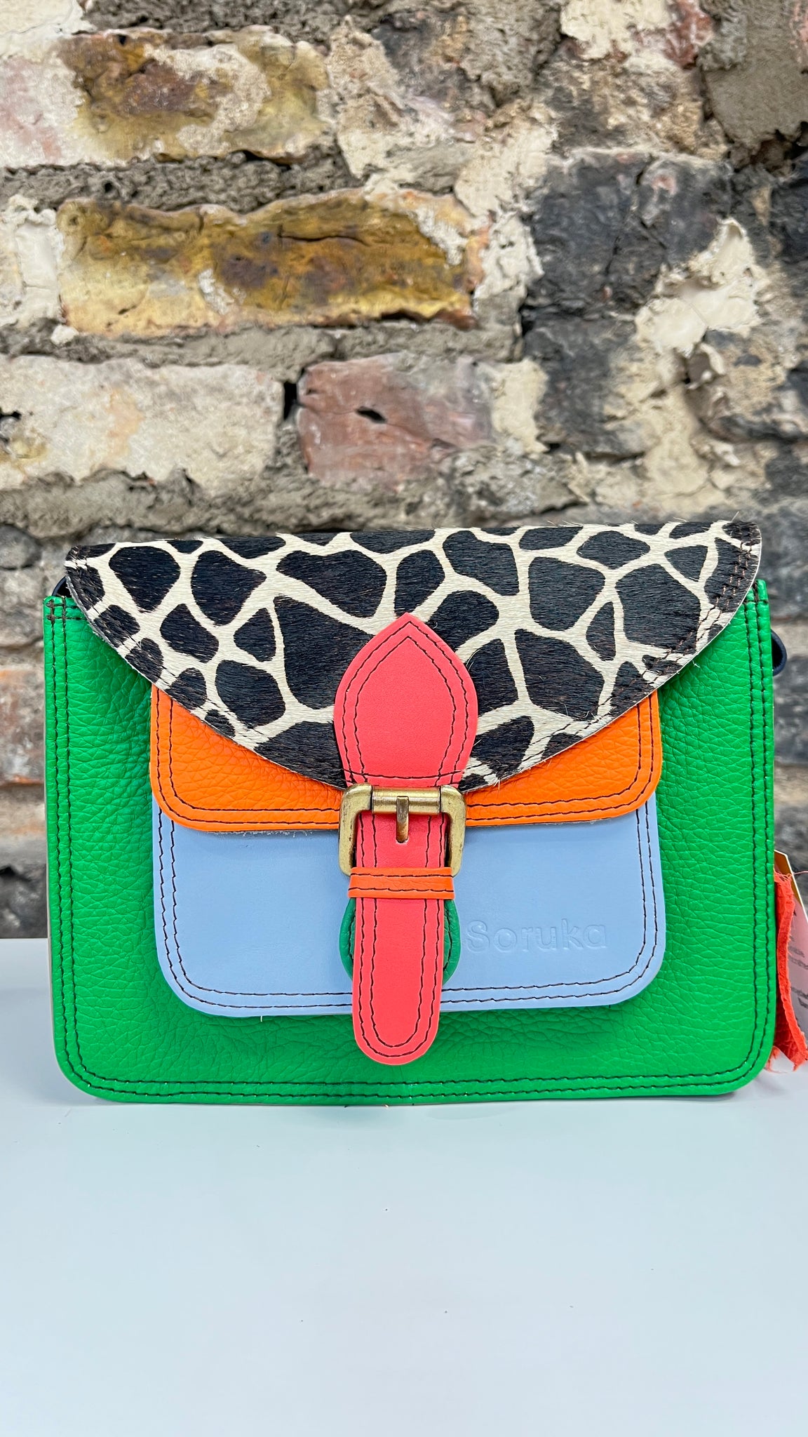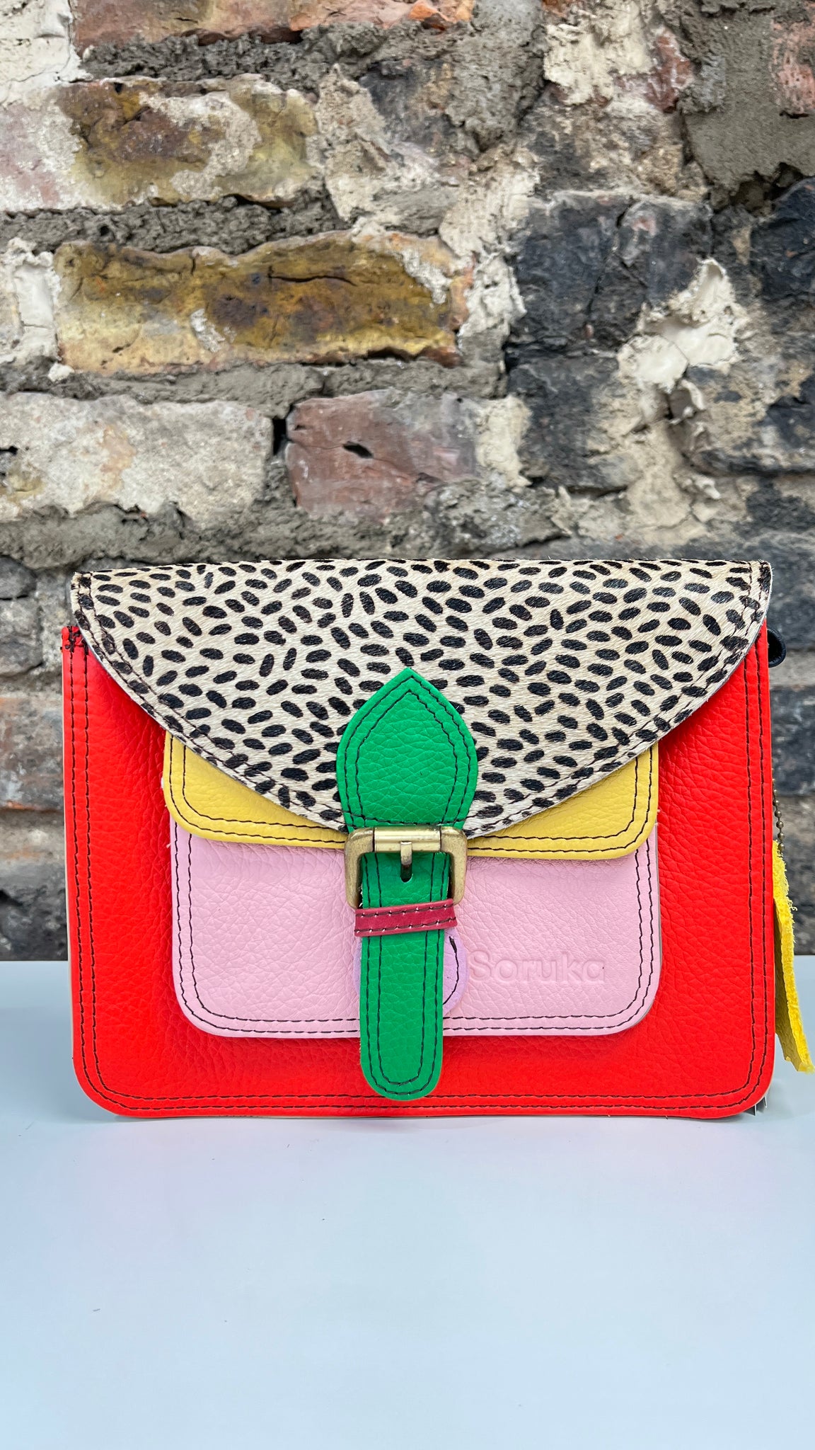 The Elma design is perfect for Soruka upcycled leather, as it has a front pocket & zipped compartment, allowing our makers to use lots of different colours, making each bag truly unique, colourful & fun!