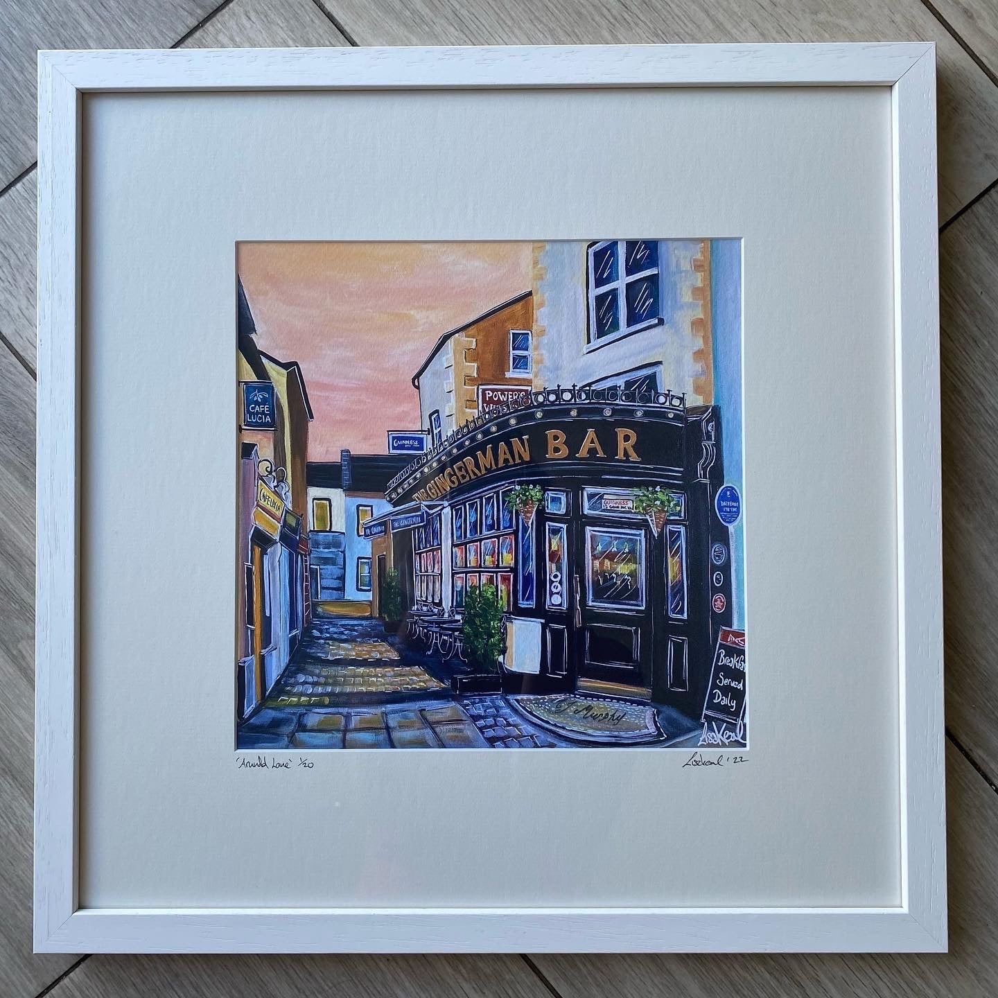 A colourful view from outside The Gingerman Print size 10x10”, Mount and frame size 16x16”