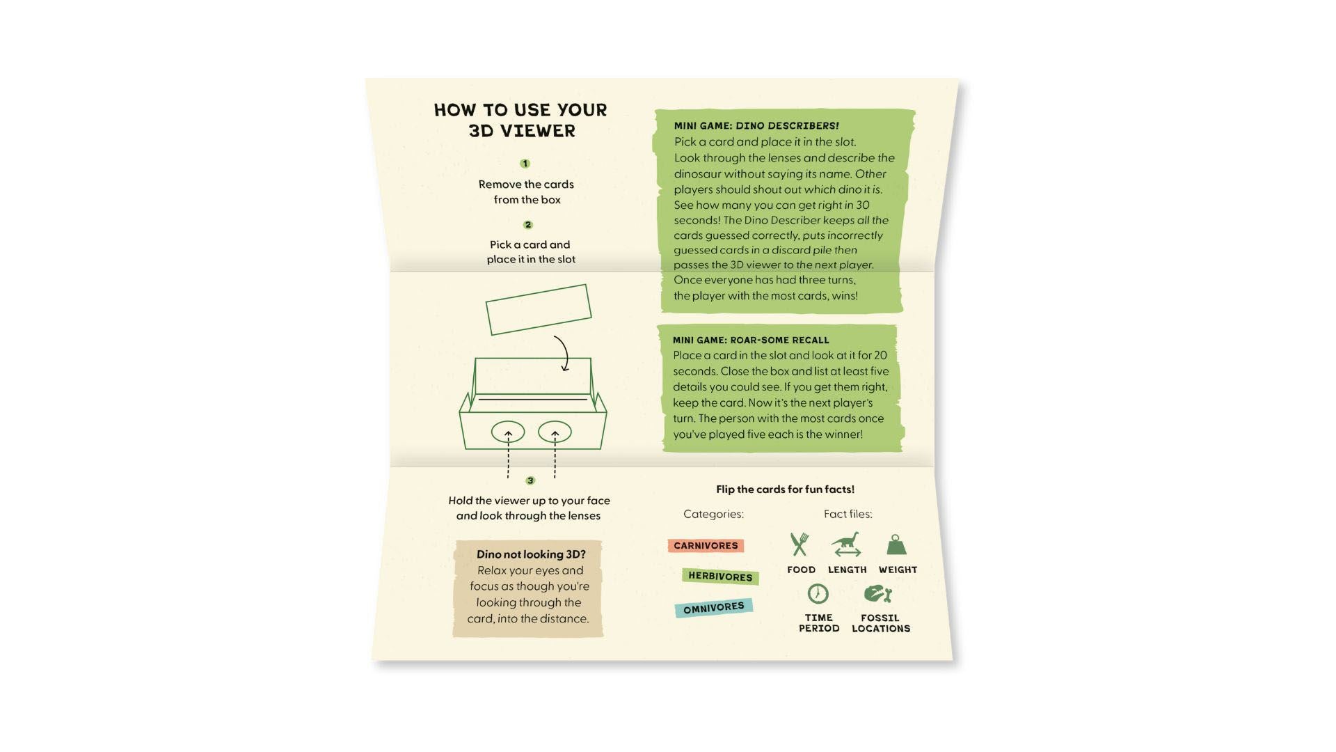 See 30 dinosaurs in incredible 3D with this immersive viewer – including a charging triceratops, and a T-Rex mid-roar! Choose a dinosaur card and place it in the box, then look through the glasses to enter the world of the dinosaurs. Turn over the cards to discover fun facts and observation games. Kit contains: 3D lenses, 30 dinosaur cards, and an instructions and games leaflet. Suitable for children aged 3+