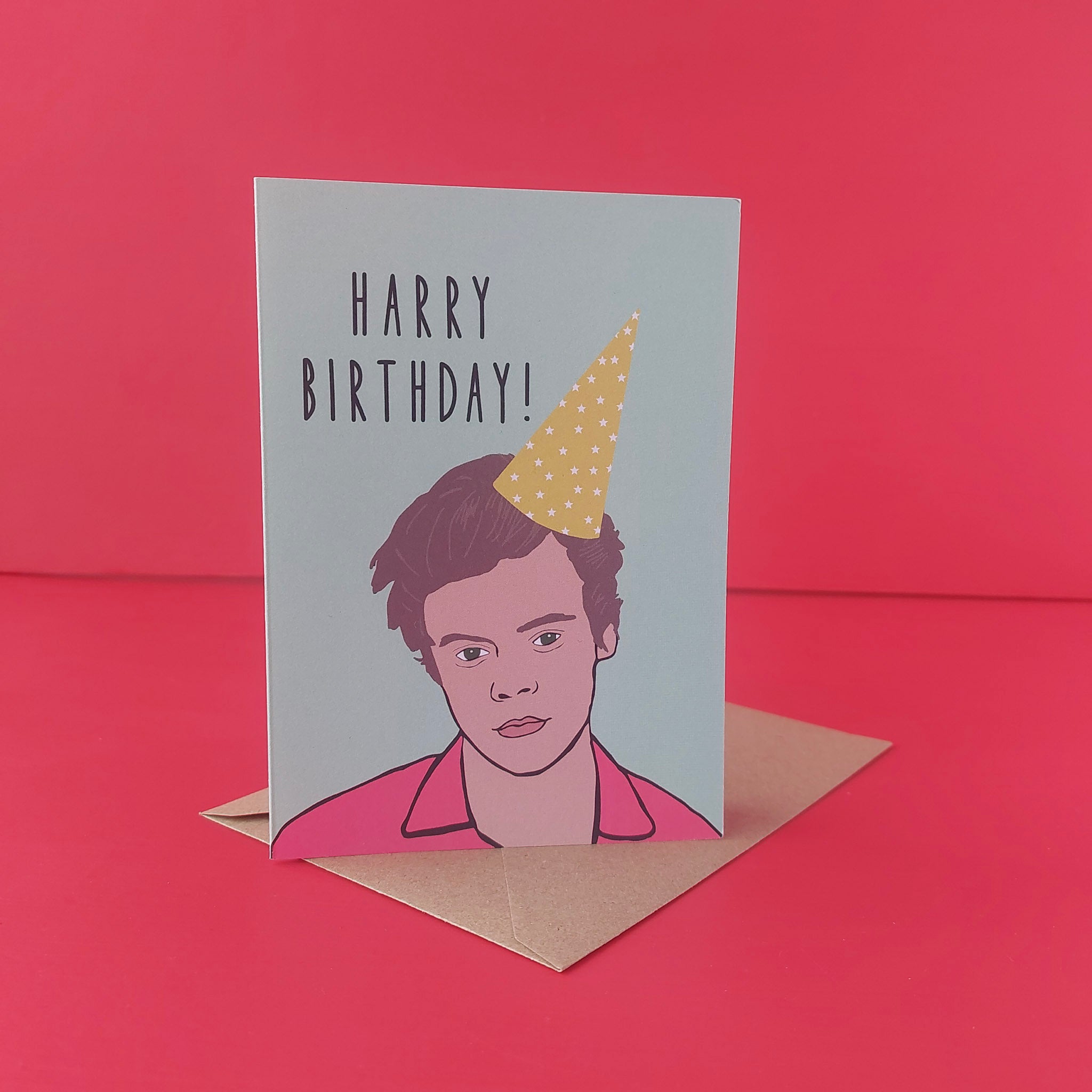 Colourful illustration of Harry Styles with a party hat, the perfect birthday card for the Harrie in your life āœØļøĀ